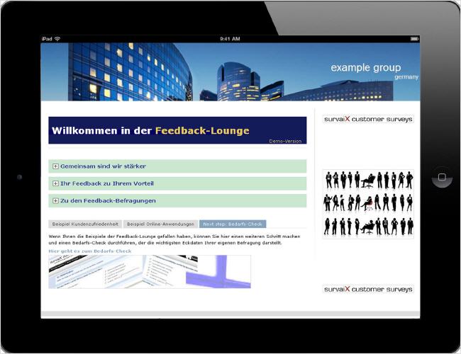 Im Beispiel unten sehen eine exemplarische Landing-Page für Kunden in Ihrem Befragungs-Projekt. Ziel dieser Feedback-Lounge ist, den Kunden nicht "kalt" in die Befragung zu stürzen, sondern ihn in Ihrem individuellen Corporate-Umfeld zu empfangen. Von hier aus gelangt Ihr Kunde zu den eigentlichen Befragungen. Probieren Sie es einfach aus!